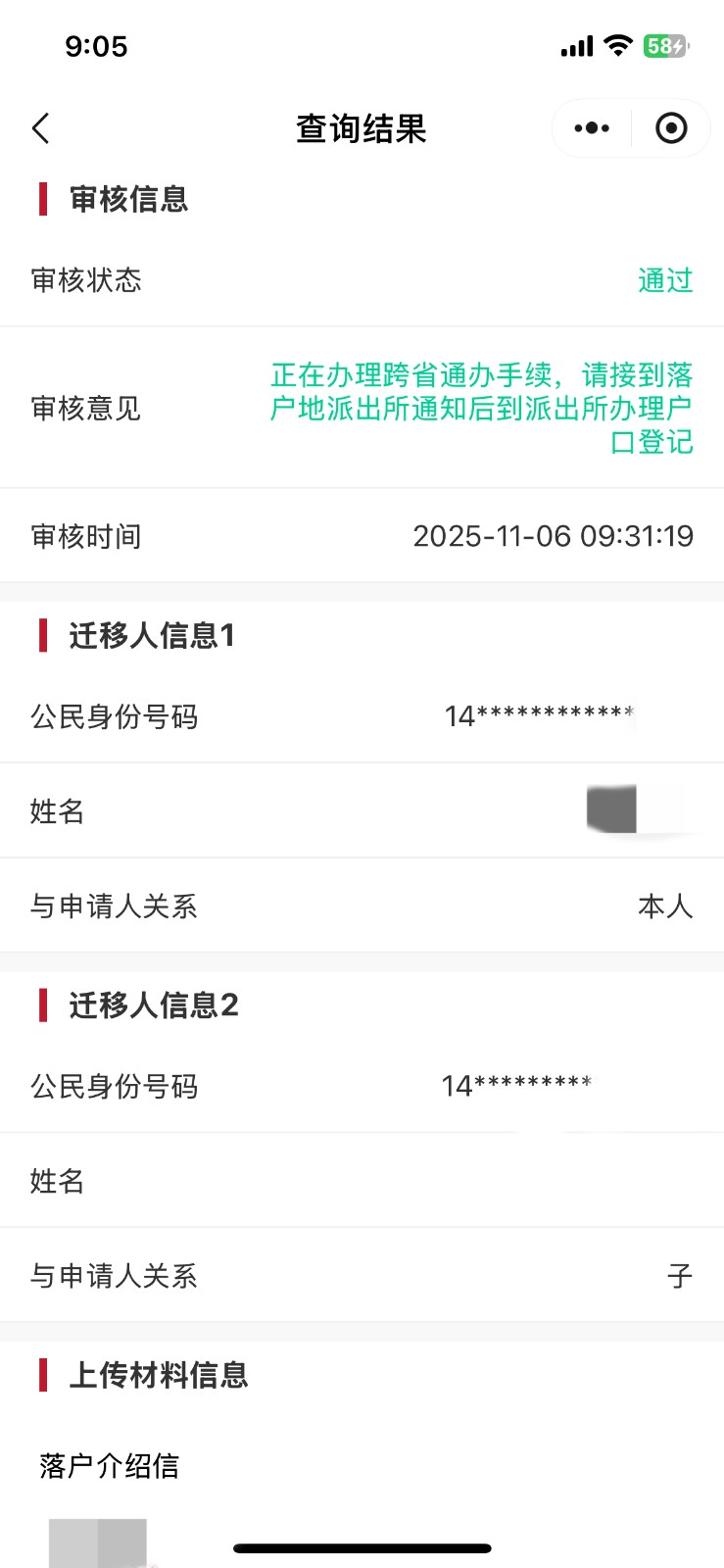 复审通过后,申请人会收到落户审批通过的短信,请进入“微信小程序-京通”,搜索“工作调动进京户口准迁手续办理” --> “户口迁移全程网办及跨省通办”-->查询个人信息,申请人及随迁人员均须将“已办结”页面截图发送至户口办邮箱。截图示例如下:
